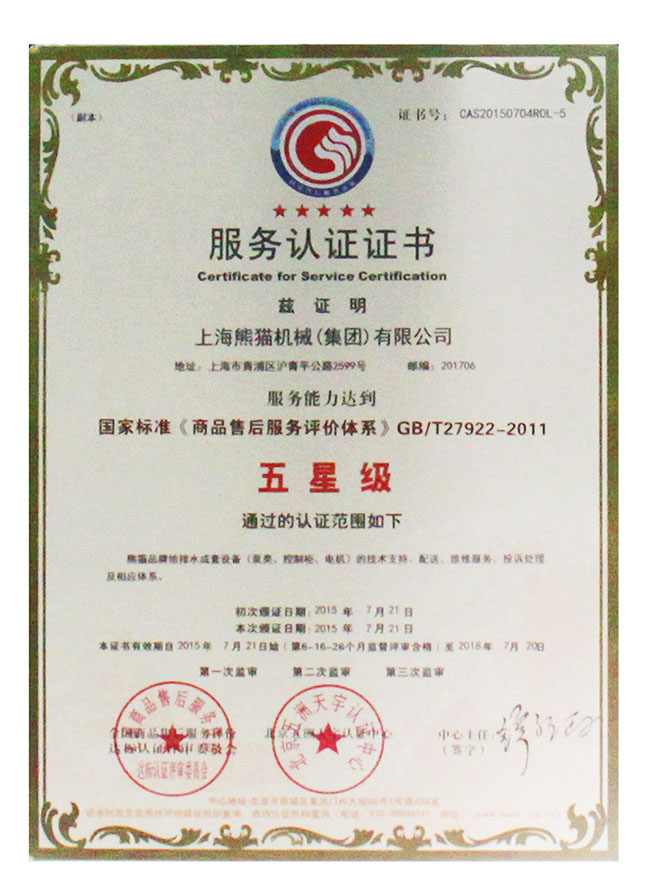 2015年9月20日,第七屆全國(guó)售后服務(wù)評(píng)價(jià)活動(dòng)發(fā)布會(huì)在北京舉行,會(huì)上我們上海熊貓機(jī)械(集團(tuán))有限公司榮獲“全國(guó)售后服務(wù)行業(yè)十佳”稱號(hào);并在會(huì)上由中國(guó)輕工業(yè)聯(lián) 合會(huì)會(huì)長(zhǎng)步正發(fā)為我們熊貓頒發(fā)《商品售后服務(wù)評(píng)估體系》五星級(jí)認(rèn)證證書(shū)。